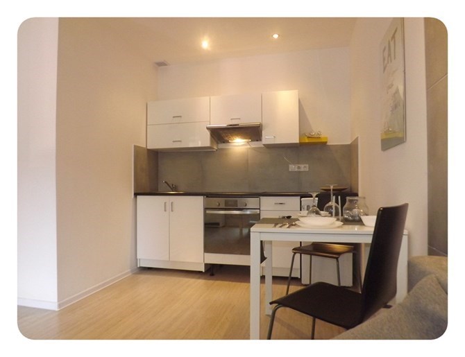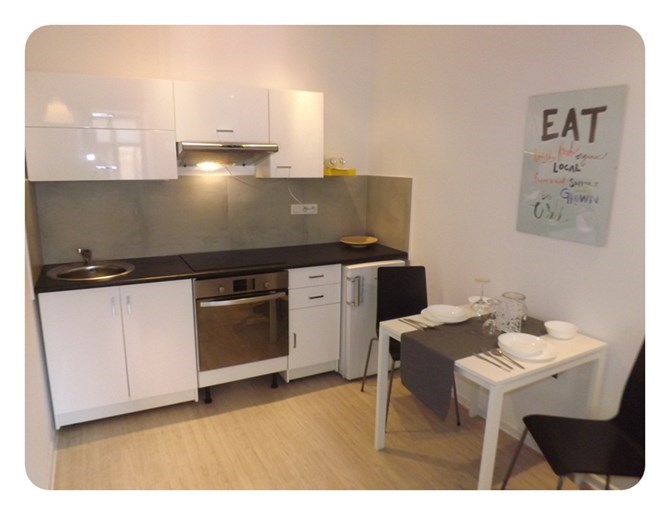 Aneks kuchenny: szafki kuchenne, płyta ceramiczna, piekarnik, okap, lodówka, stół, 2 krzesła.
