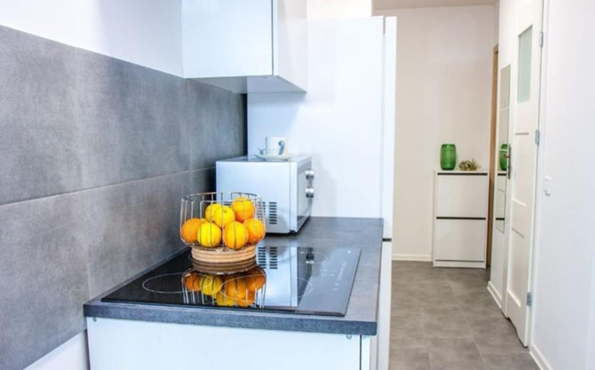 Aneks kuchenny: lodówko-zamrażarka, płyta indukcyjna, okap, mikrofalówka, meble kuchenne stojące i wiszące.