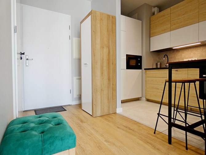 Lokal o powierzchni 32,67 m2 mieści się na 4. piętrze nowego apartamentowca.