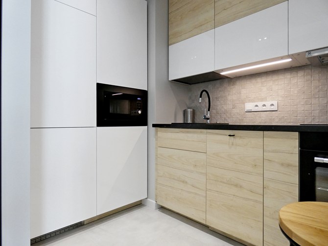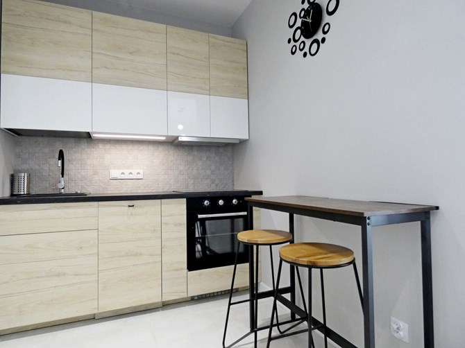 Kuchnia: lodówko-zamrażarka, okap, 4-palnikowa płyta indukcyjna, zmywarka, mikrofalówka, piekarnik, stół + 2 hokery.
