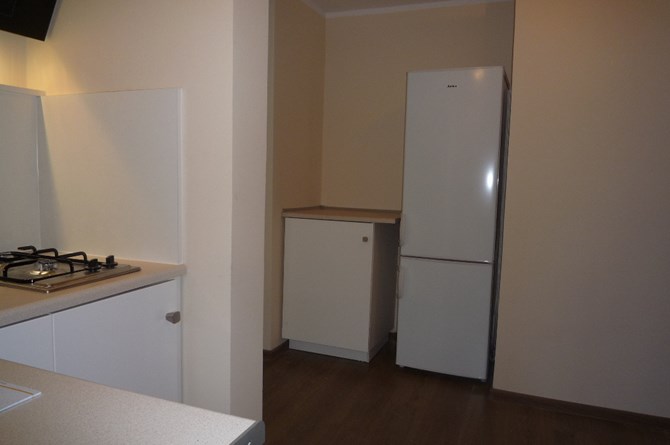 Na wyposażeniu kuchni znajduje się komplet mebli kuchennych, płyta ceramiczna z okapem i chłodziarko-zamrażarką.