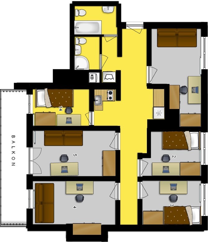Pokoje są umeblowane w miejsce do spania, szafę i biurko z krzesłem.