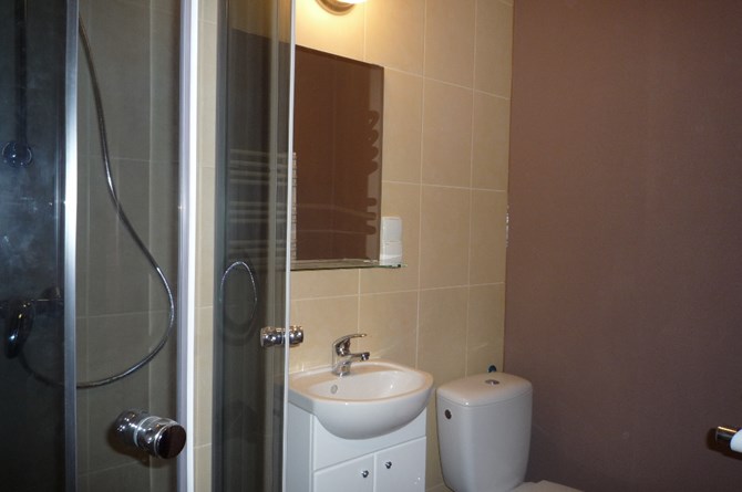 Łazienki (2) - w jednej jest kabina prysznicowa, umywalka i WC, a w drugiej -wanna z umywalka i WC.