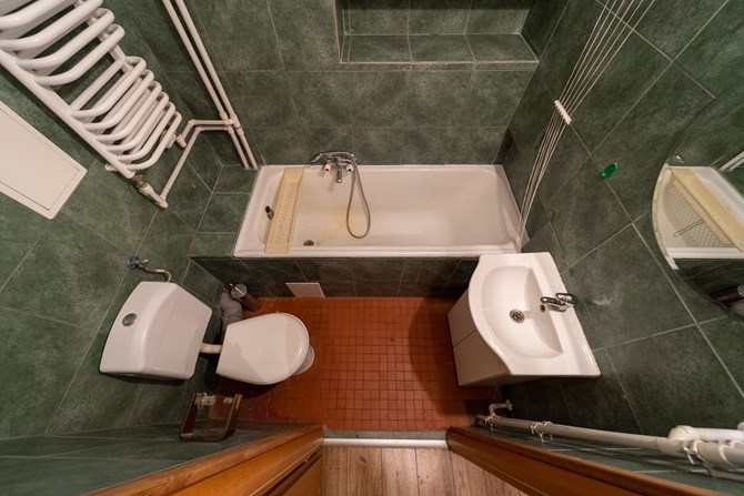 Łazienka: wanna, umywalka z szafką, toaleta.