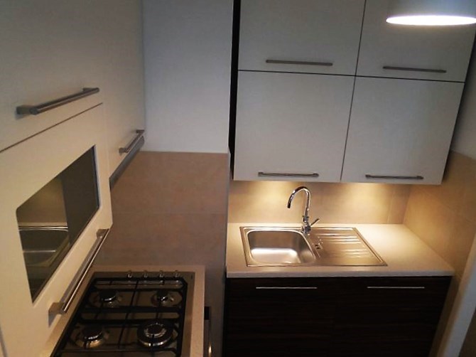 Kuchnia: czteropalnikowa kuchenka gazowa, piekarnik, pochłaniacz, lodówka, pralka, zestaw mebli kuchennych.