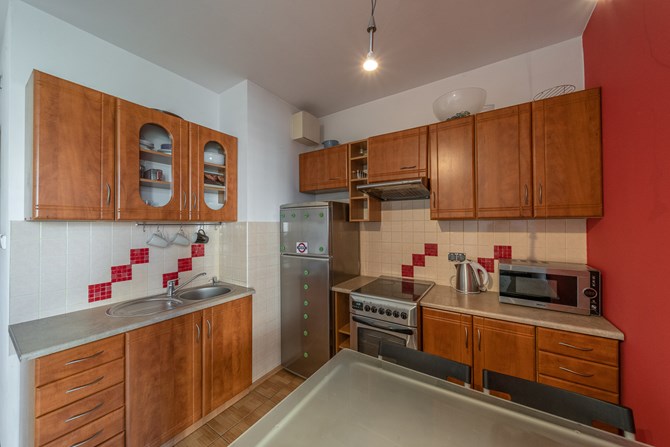 Kuchnia: szafki, sprzęt AGD (bez zmywarki), płyta grzewcza.