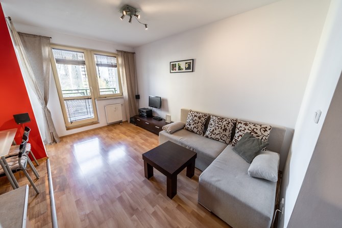 Pokój: rozkładana, narożna kanapa 140x200cm, stolik, szafka RTV, TV, dobry sprzęt stereo, drewniane żaluzje.