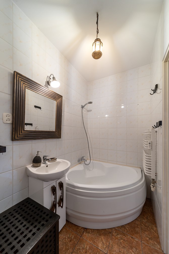 Łazienka: pralka, duża, narożna wanna, umywalka.
