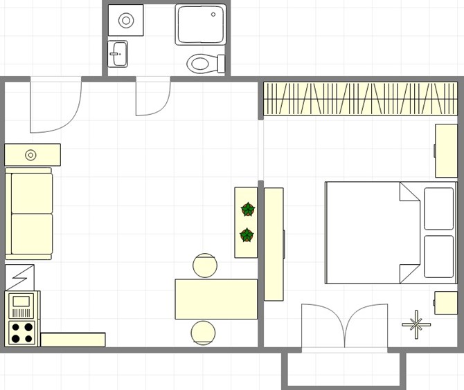 Na 36 m2 znajdują się salon z otwartą kuchnią, sypialnia, przedpokój, łazienka.