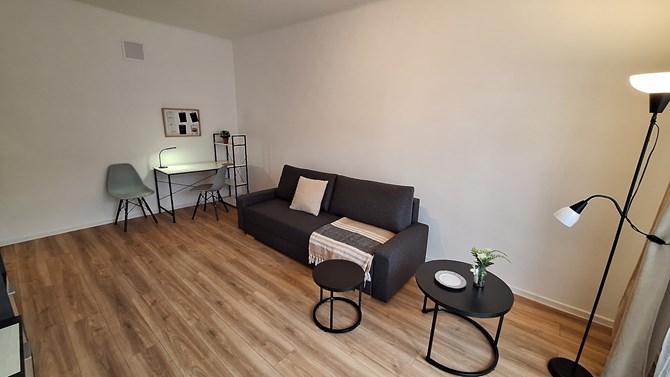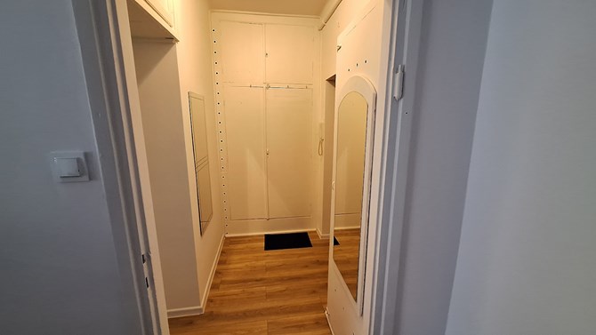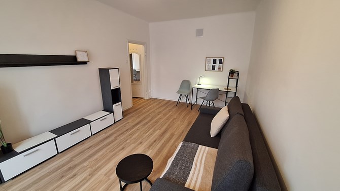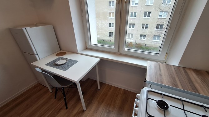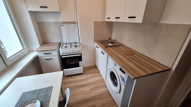Funkcjonalny układ pomieszczeń – z przedpokoju wchodzimy do widnej kuchni, na prawo znajduje się łazienka z WC, a na lewo przytulny pokój dzienny z wyjściem na balkon.