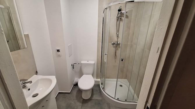 Łazienka z WC: kabina prysznicowa, umywalka, lustro.