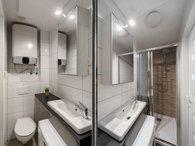 Łazienka razem z WC: lustro z półką, kabina prysznicowa, pralka.