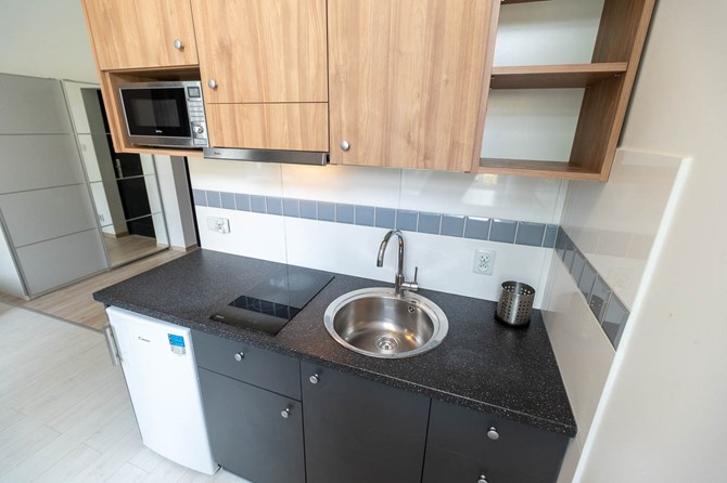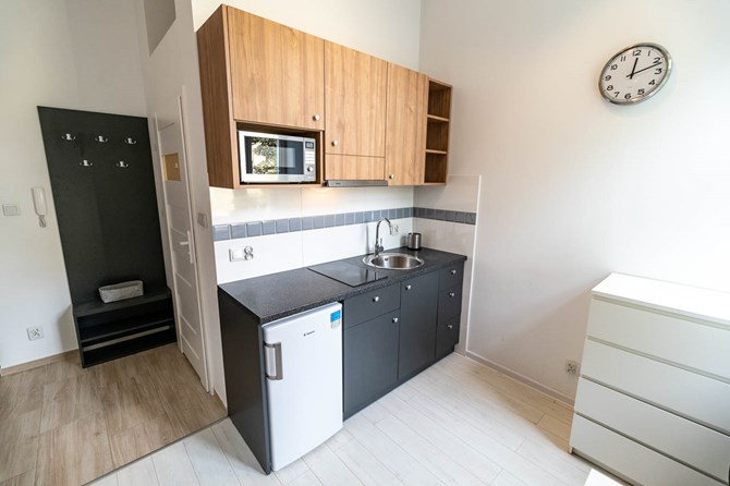 Aneks kuchenny: lodówka, kuchenka, mikrofalówka, szafki wiszące i stojące.