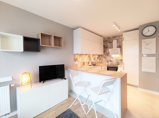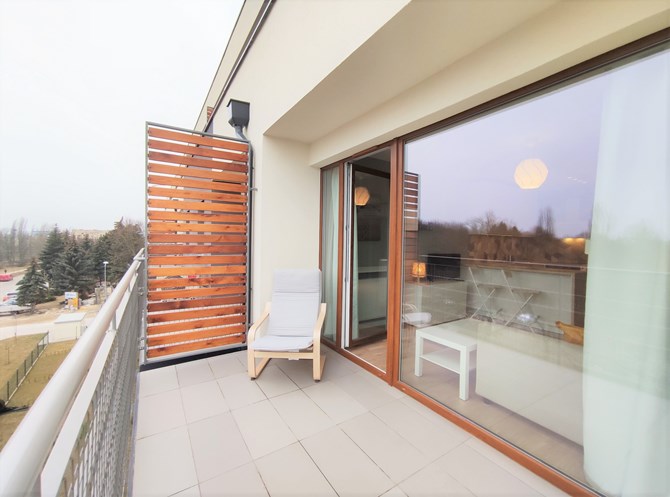 Do wynajęcia dwupokojowy, komfortowo umeblowany apartament z dużym balkonem w nowoczesnym budynku przy ul. Górniczej 26, tuż obok Parku im. Szarych Szeregów.