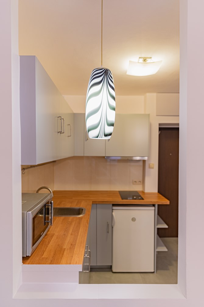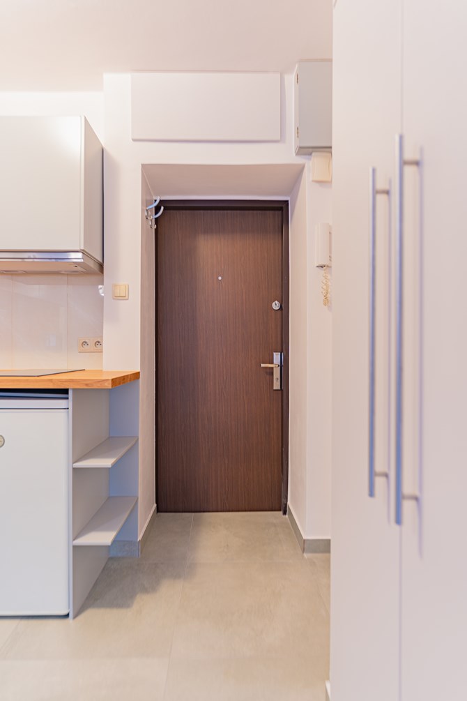 Składa się z pokoju z aneksem kuchennym, łazienki oraz przedpokoju.