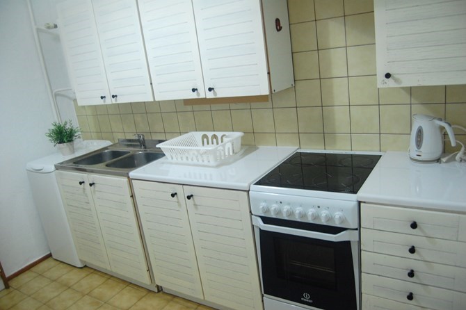 Kuchnia: szafki wiszące, stojące, duża lodówko- zamrażalka marki Whirlpool, kuchenka elektryczna z piekarnikiem Indesit, czajnik elektryczny, zlew 2- komorowy, pralka Mastercook ładowana od góry.