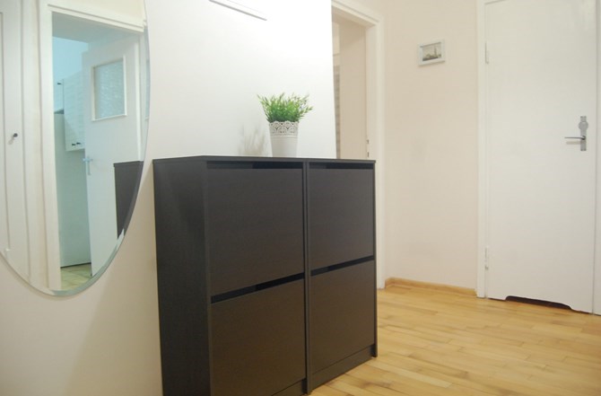 Przedpokój: szafka na buty, duże lustro oraz zamykana na drzwi mała garderoba/ schowek z półkami, wieszakami na ubrania, z deską do prasowania, odkurzaczem.