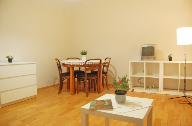 Pokój 1: rozkładana sofa, duży okrągły stół z krzesłami, mały stolik kawowy, komoda, regał z półkami, mały telewizor, lampa stojąca.