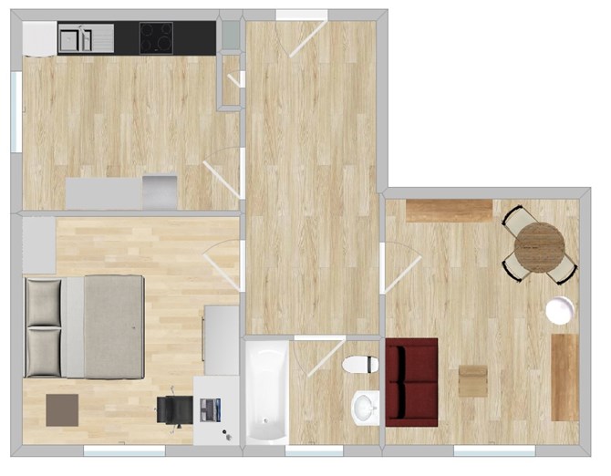 Składa się z salonu, sypialni, kuchni, łazienki, małej garderoby/schowka i przedpokoju.