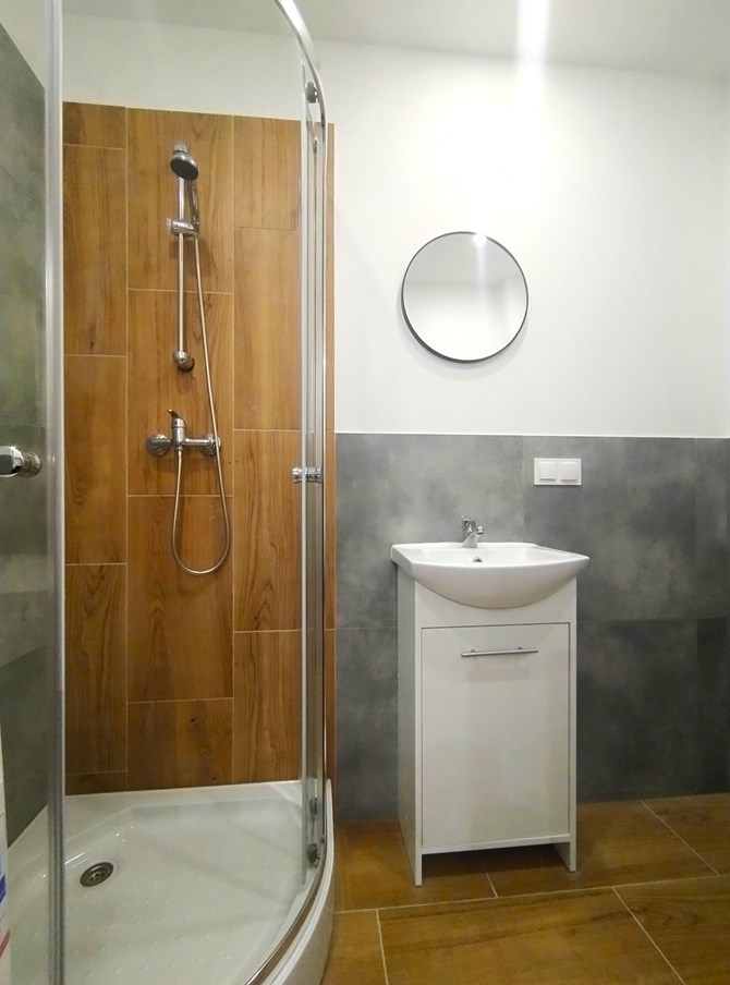 Łazienka razem z WC: kabina prysznicowa, umywalka, lustro