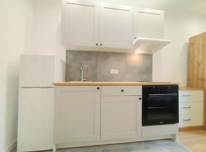 Aneks kuchenny: szafki wiszące i stojące, lodówka, dwupalnikowa płyta elektryczna, zlewozmywak, piekarnik.