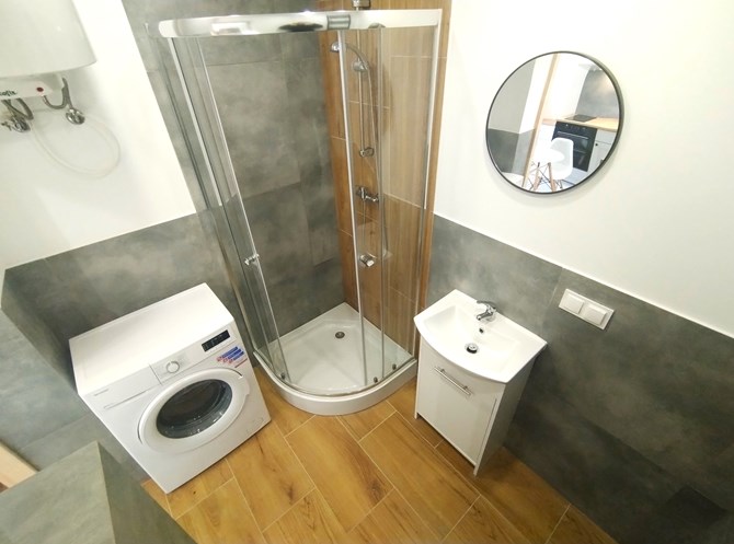 Łazienka razem z WC: kabina prysznicowa, umywalka, lustro.