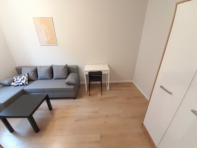 Pokój: kanapa rozkładana, stolik kawowy , komoda, szafa, biurko z krzesłem.
