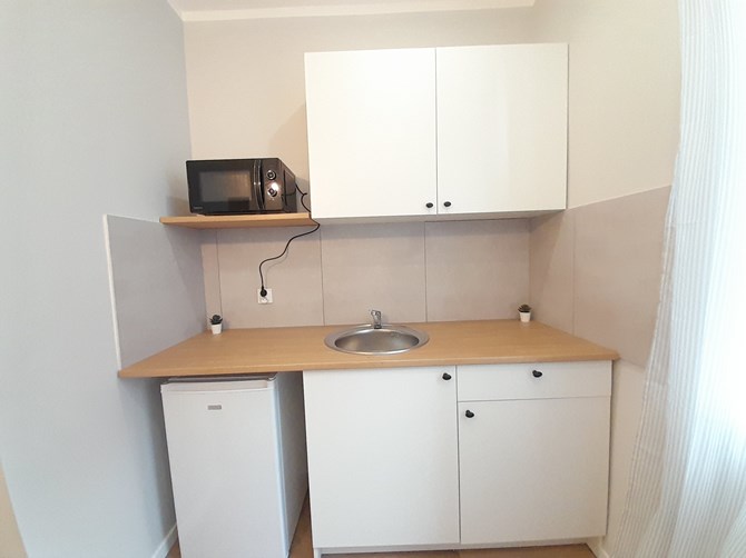 Kuchnia: szafki, płyta elektryczna, mikrofala, lodówka, stół z 2 krzesłami, pralka.