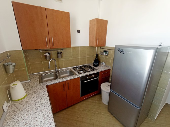 Kuchnia: lodówko-zamrażarka, okap, 4-palnikowa płyta gazowa, zmywarka, piekarnik, ekspres kapsułkowy, czajnik, zlewozmywak.