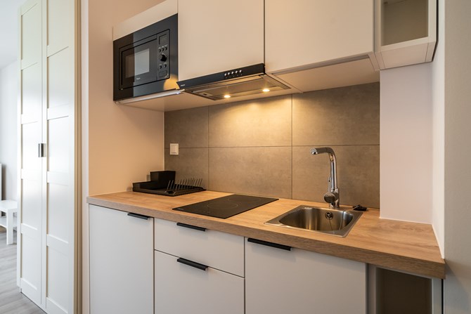 Kuchnia: szafki wiszące i stojące, lodówka, dwupalnikowa płyta indukcyjna, mikrofalówka, zlewozmywak.