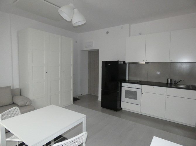 Aneks kuchenny: lodówko-zamrażarka, okap, 2-palnikowa płyta indukcyjna, piekarnik, zlew.