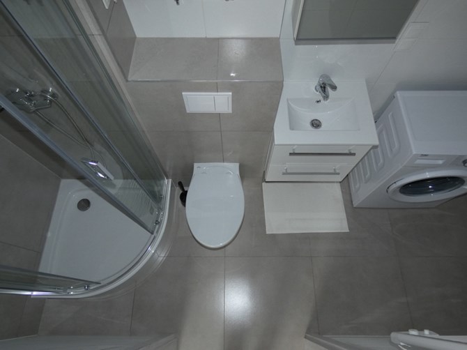 Łazienka: kabina prysznicowa, pralka, WC, umywalka.