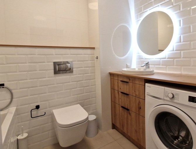 Łazienka (razem z WC): wanna, pralka, wisząca szafka, lustro z półką.