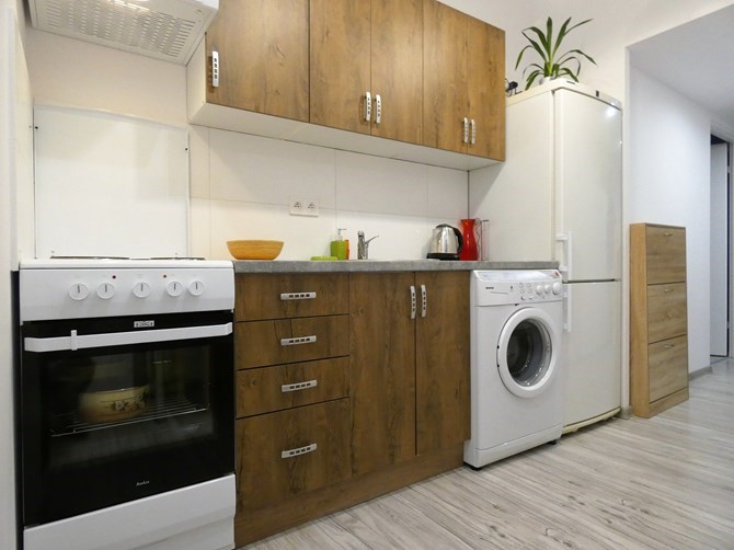 Aneks kuchenny: szafki stojące i wiszące, stół z krzesłami, lodówka, piekarnik elektryczny, czteropalnikowa płyta elektryczna, mikrofalówka, pralka oraz okap.
