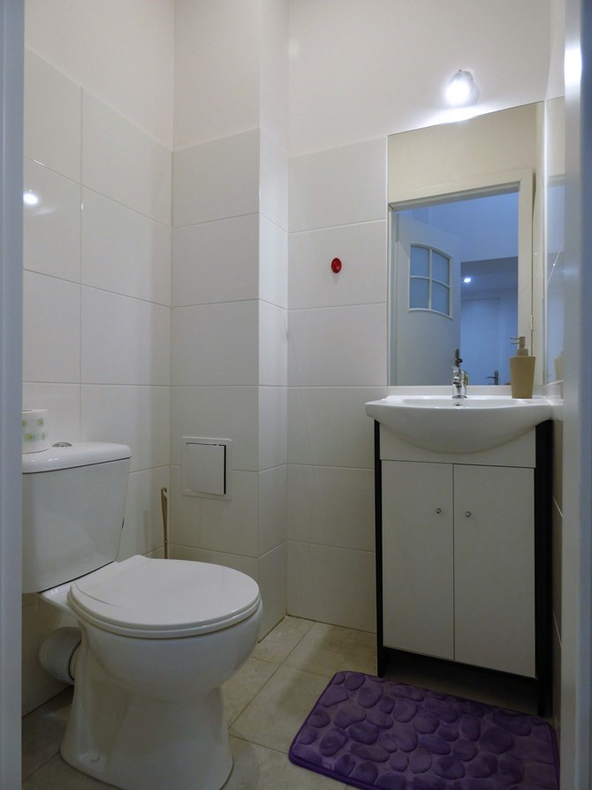 Łazienki: kabina prysznicowa, umywalka z szafką i lustrem, dodatkowe WC z umywalką i lustrem.