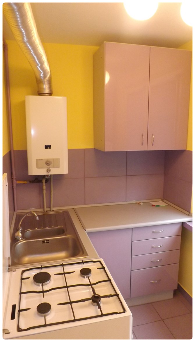 Kuchnia: szafki kuchenne, zlew, kuchenka.
