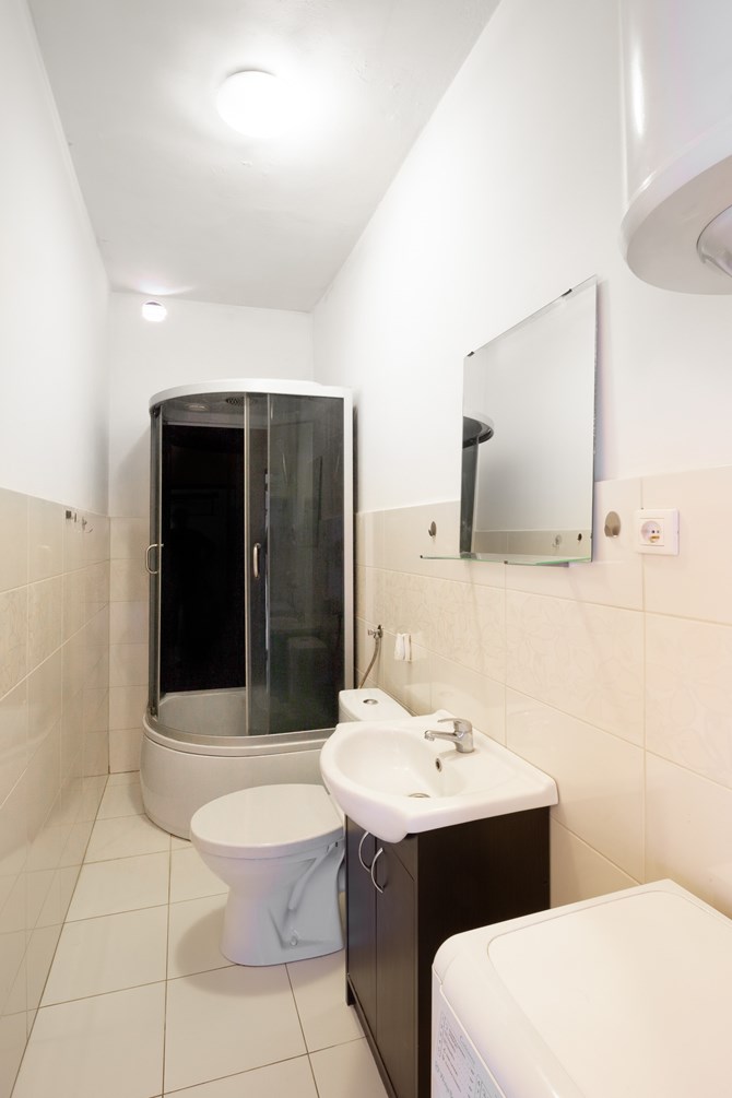 Łazienka: kabina prysznicowa, WC, umywalka z szafką, pralka.