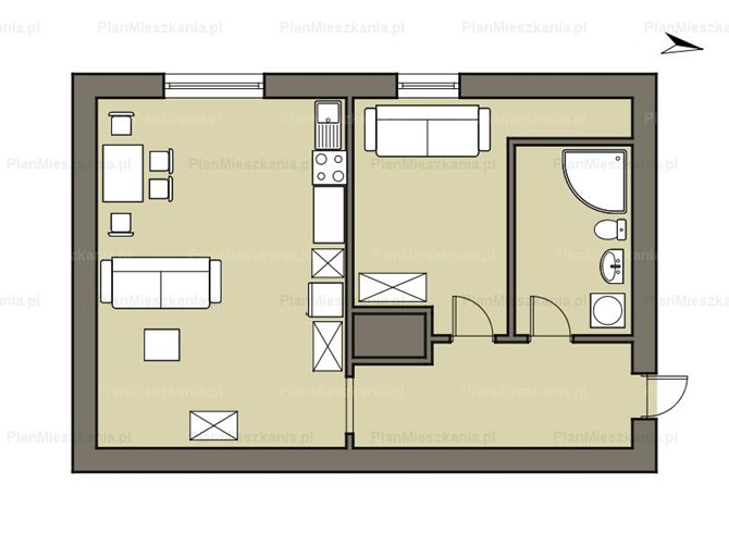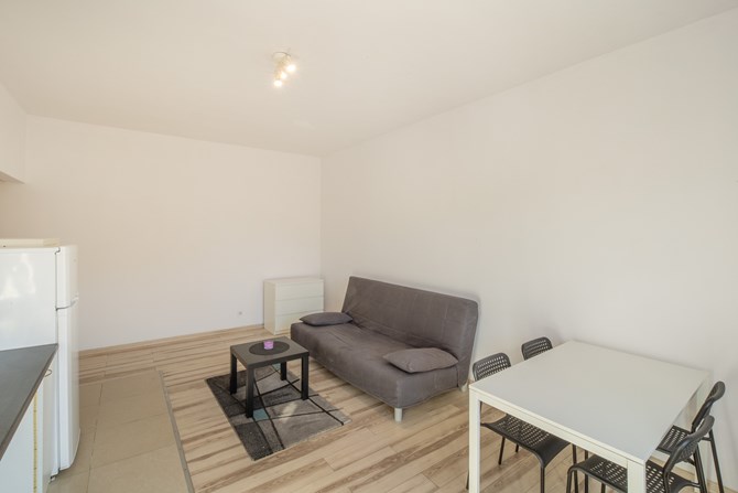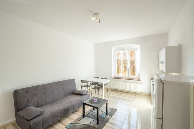 Dwa oddzielne pokoje – salon z aneksem kuchennym i sypialnia.