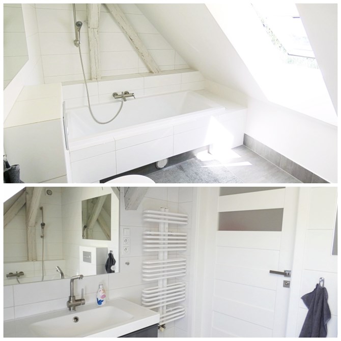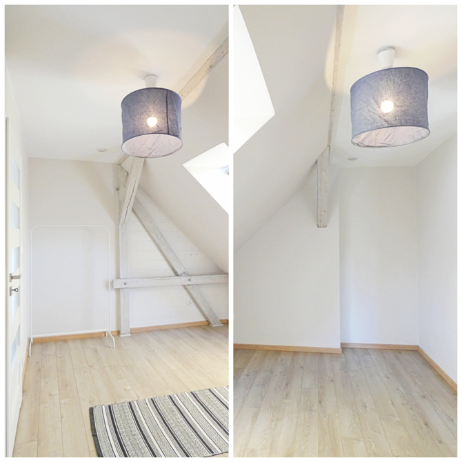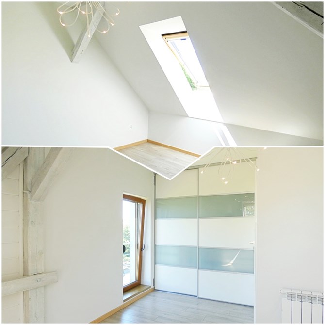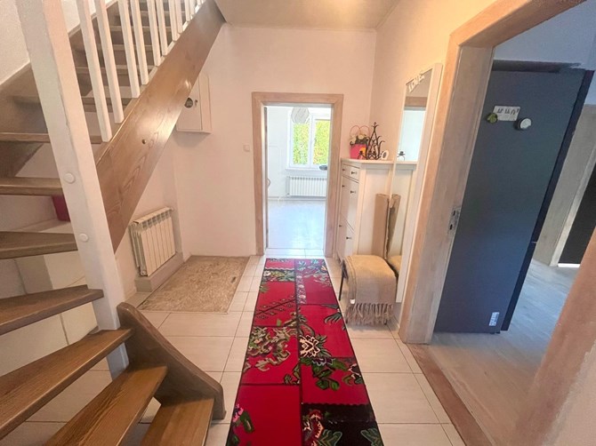 Na piętrze łazienka z wanną, WC oraz umywalką. Jeden z pokoi wyposażony w szafę oraz komodę.