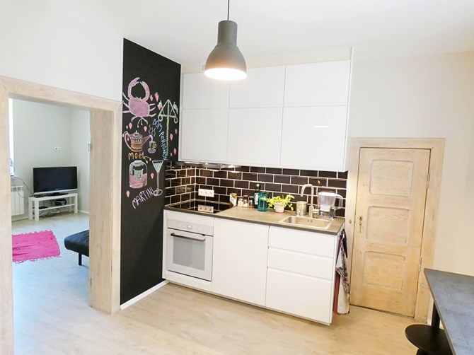 Kuchnia wyposażona w lodówkę, szafki, blat 2 osobowy, zmywarkę, piekarnik, płytę indukcyjną, okap, czajnik elektryczny, ekspres do kawy. Do dyspozycji podstawowe przybory kuchenne.