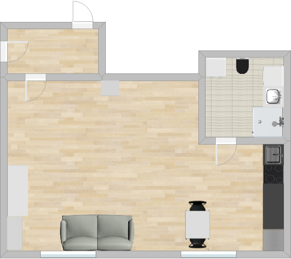 Salon: szafka na buty, wieszak, szafa 3D, regał, kanapa, stół z krzesłami.