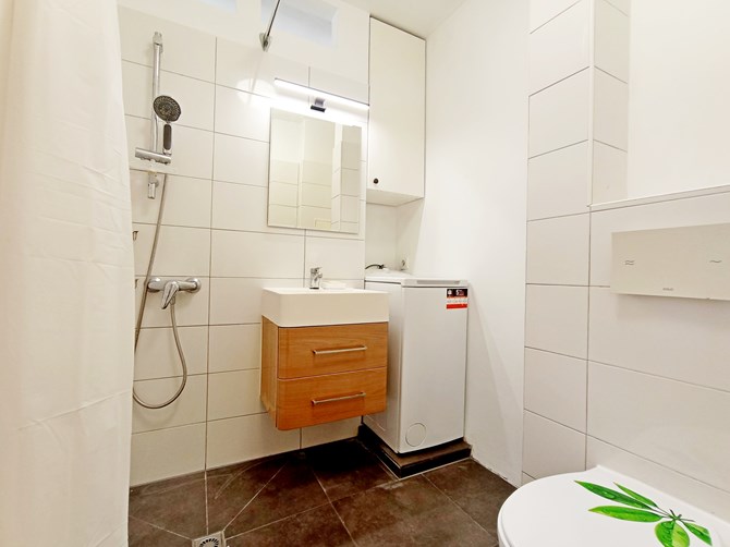 Łazienka: pralka, prysznic, WC, umywalka.