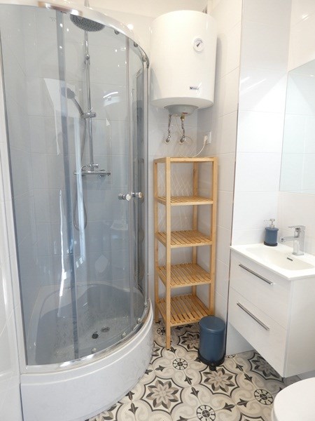 Łazienka z WC: kabina prysznicowa, umywalka, lustro, regał.