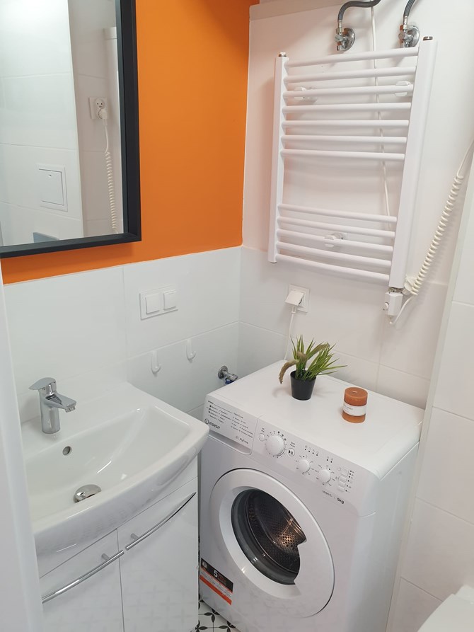 Łazienka z WC: kabina prysznicowa, umywalka, pralka.