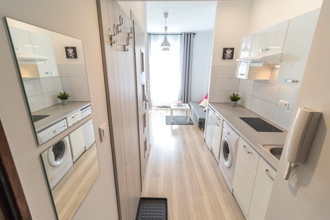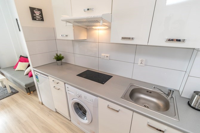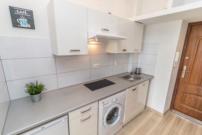Aneks kuchenny: lodówka, pralka, zlewozmywak, płyta grzewcza, okap, szafki wiszące i stojące.