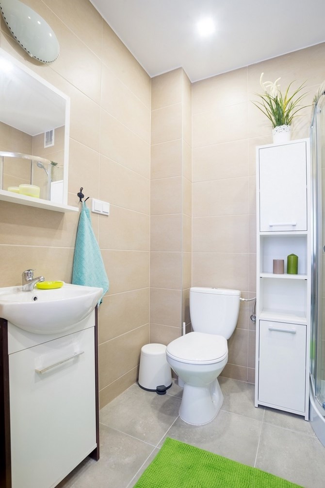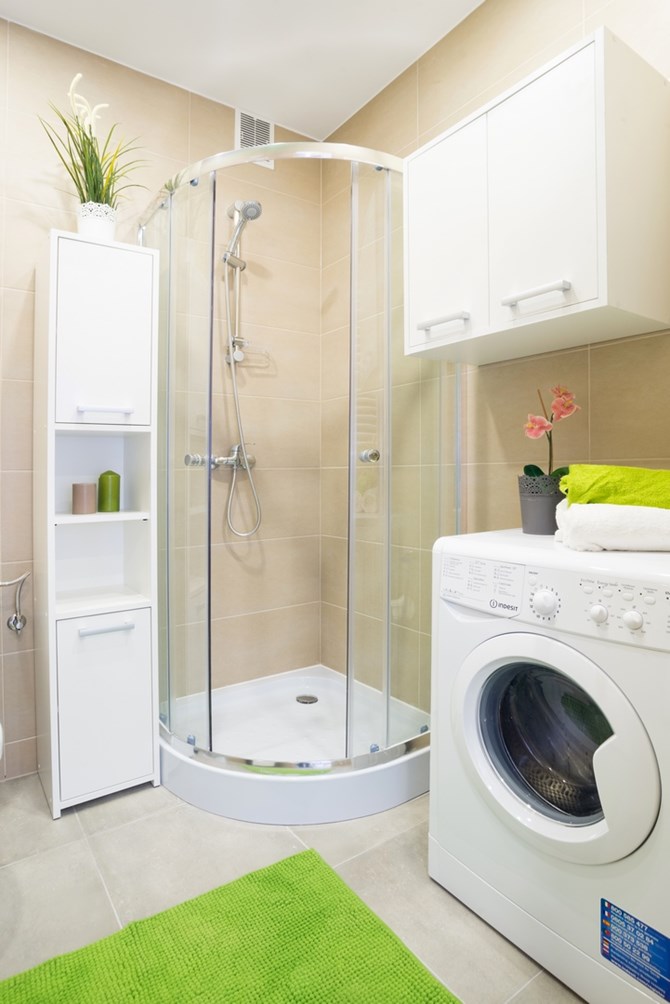 Łazienki: pralka, kabina prysznicowa, umywalka, toaleta, szafki.