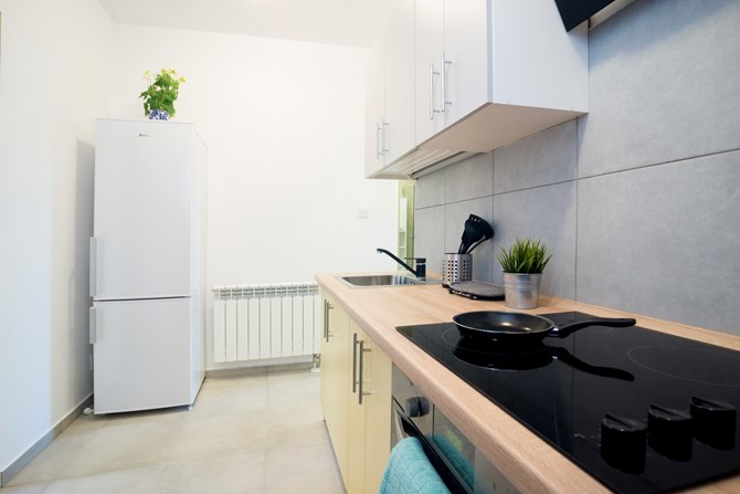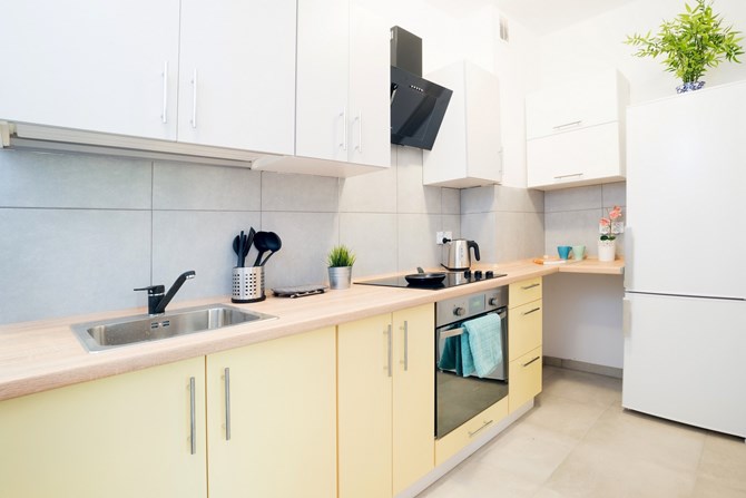 Kuchnie: lodówko-zamrażarka, piekarnik, okap, płyta ceramiczna, mikrofalówka, czajnik bezprzewodowy.