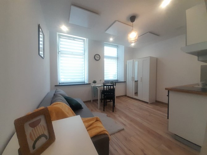 Do wynajęcia funkcjonalne studio w kamienicy przy ul. Modrzejowskiej 89 w Będzinie - idealne dla singla lub pary, z szybkim dostępem do sklepów, kawiarni i centrum handlowego.