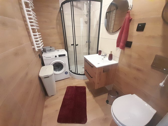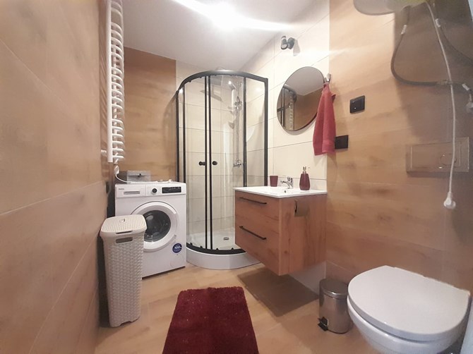 Łazienka z WC: kabina prysznicowa, umywalka, szafka, lustro, pralka.
