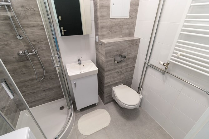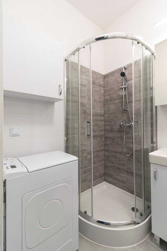 Łazienka: kabina prysznicowa, umywalka, szafki, pralka.